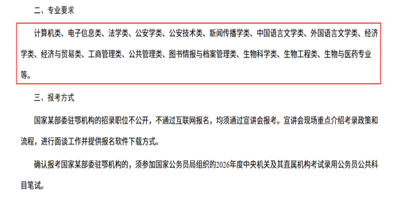 武汉纺织大学10月15日召开《公务员 | 国家某部委驻鄂机构2026年度公务员招录宣讲公告》,专业要求如下:
